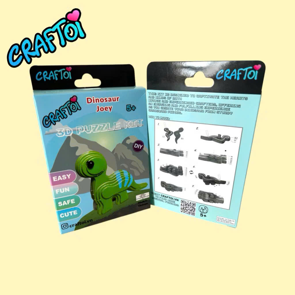 Bộ lắp ráp mô hình 3D Craftoi - Sáng tạo nhân vật của riêng mình mà không cần kéo Sử dụng các chất liệu có thể tái chế và an toàn cho trẻ nhỏ, bộ lắp ráp mô hình 3D bao gồm bìa cứng đã cắt hình sẵn, keo sữa và chỉ dẫn trong mỗi hộp. Chỉ cần tách rời các mảnh ghép và dán chúng lại với nhau để tạo nên nhân vật hoàn chỉnh chỉ trong vòng 20-30 phút. Bộ sản phẩm không chỉ nâng cao kỹ năng tư duy mà còn giúp khơi nguồn sáng tạo ở trẻ. Giúp xây dựng gắn kết giữa các thành viên, ngoài ra còn là hoạt động thú vị không thể thiếu trong mỗi căn phòng nhỏ. Sản phẩm được sản xuất tại Việt Nam, đã được chứng nhận đáp ứng các điều kiện về an toàn cho trẻ nhỏ. Bộ sản phẩm được thiết kế dành cho các “Nhà sáng tạo tí hon” từ 5 tuổi trở lên. Giúp nâng cao khả năng tư duy, sáng tạo; rèn luyện sự khéo léo giữa tay và mắt. Chỉ cần tháo rời các mảnh ghép và dán chúng lại với nhau theo chỉ dẫn để có nhân vật hoàn chỉnh. Thông tin sản phẩm Mã hàng: DINOSAUR JOEY 3D Puzzel Kit Tuổi sử dụng: 5+ Kích thước: 9,4x7,5 cm Một bộ bao gồm: 19 chi tiết bằng giấy 2 chi tiết bằng nhựa Keo dán Bảo quản: Nơi khô thoáng. Thành phần: giấy, keo dán, nhựa. Năm sản xuất: 2024 Độ bền của sản phẩm: sử dụng không giới hạn!!! Xuất xứ VIỆT NAM !!!!!!! Được Trung Tâm Giám Định Và Chứng Nhận Hợp Chuẩn Hợp Quy VietCert đánh giá chứng nhận phù hợp Quy chuẩn QCVN 3:2019/BKHCN của Bộ Khoa Học - Công nghệ.     CRAFTOI Educational toy - DINOSAUR JOEY 3D Puzzle Kit Make your 3D DINOSAUR! Designed for "Little Creators" aged 5 and up. Help to develop critical thinking, creativity, and hand-eye coordination. Simply pop out the pre-cut pieces and follow the easy-to-understand instructions to assemble a fully crafted character. About the product 5+ DIMENSIONS: 9,4x7,5 cm THE SET INCLUDES: 19 PAPER PARTS 2 PLASTIC PARTS GLUE Storage: in dry ventilated rooms. Materials: paper, glue, plastic. Service life is not limited !!! MADE IN VIETNAM Has been assessed to conform to the Standard OCIN 3:2019 BKHCN of the Ministry of Science and Technology by VIETCERT CERTIFICATION AND INSPECTION CENTRE Made from entirely high-quality cardboard, kid-friendly milky glue and recycled materials. Simply pop out the pre-cut pieces and glue them together as instructed to create a stunning 3D figure in just 20-30 minutes. The kit not only boosts critical thinking, but also helps to inspire creativity and imagination in the children. Perfect for no-screen family bonding time and wonderful activity must be added in any kid’s room. The products are made in Vietnam, complies with safety standards and certifies.