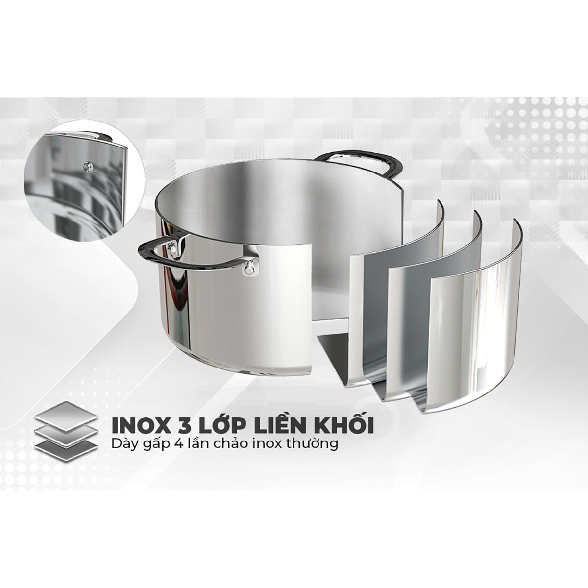 Thân nồi được làm bằng inox cao cấp Bộ nồi inox đa lớp Sunhouse Mama SHG701 có thân nồi được thiết kế 3 lớp nguyên khối: lớp ngoài cùng Inox 430 có hiệu suất bắt từ cao nhất trong các loại inox hiện nay, lớp nhôm ở giữa tăng hiệu quả truyền nhiệt, lớp trong cùng Inox 304 an toàn tuyệt đối cho sức khỏe và có khả năng kháng ăn mòn cực tốt.