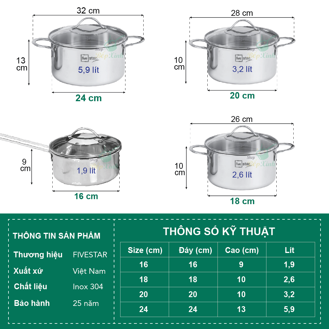 Bộ nồi gồm có : +1 Nồi Fivestar đường kính 16cm, chiều cao 9cm + nắp inox quai silicon + 1 Nồi Fivestar đường kính 20cm, chiều cao 12cm + nắp inox quai silicon +