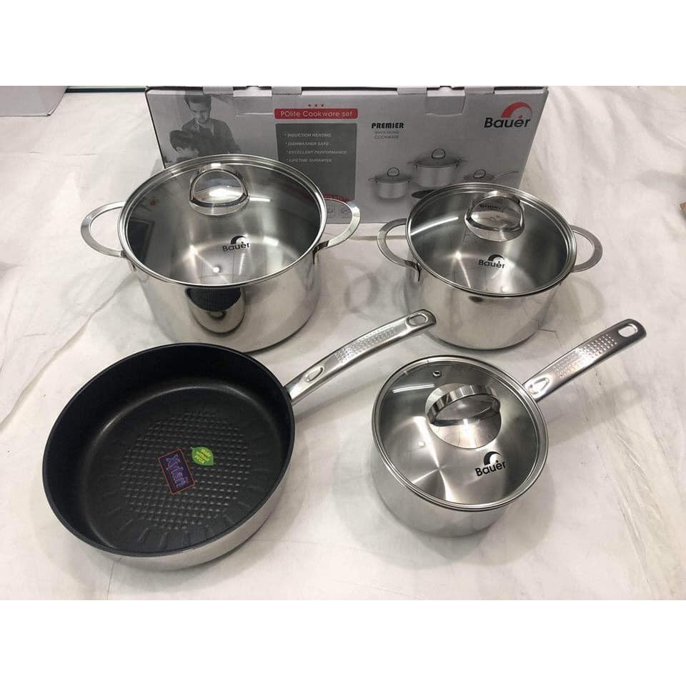 Bộ nồi chảo cao cấp Bauer Wave được thiết kế với 3 lớp kim loại nhằm tối ưu hiệu quả của từng loại chất liệu. Trong cùng là lớp inox 304 cao cấp, sáng bóng, cũng là lớp tiếp xúc trực tiếp với thức ăn. Inox 304 được đánh giá cao về độ an toàn, không bị oxi hóa, không phản ứng với thức ăn, chống trầy xước và đảm bảo dễ dàng vệ sinh.
