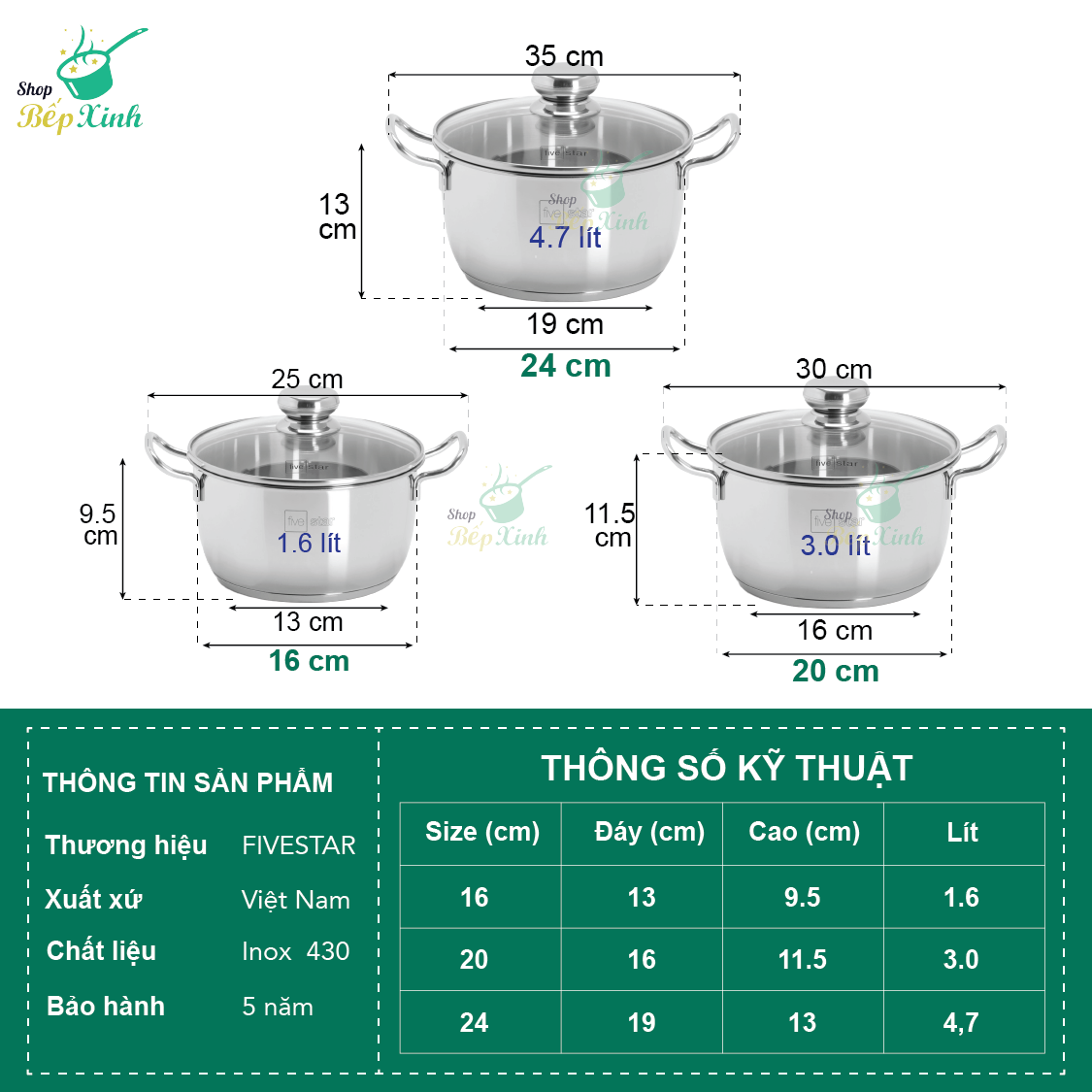 Bộ nồi gồm có : +1 Nồi Fivestar đường kính 16cm, chiều cao 9cm + nắp inox quai silicon + 1 Nồi Fivestar đường kính 20cm, chiều cao 12cm + nắp inox quai silicon +