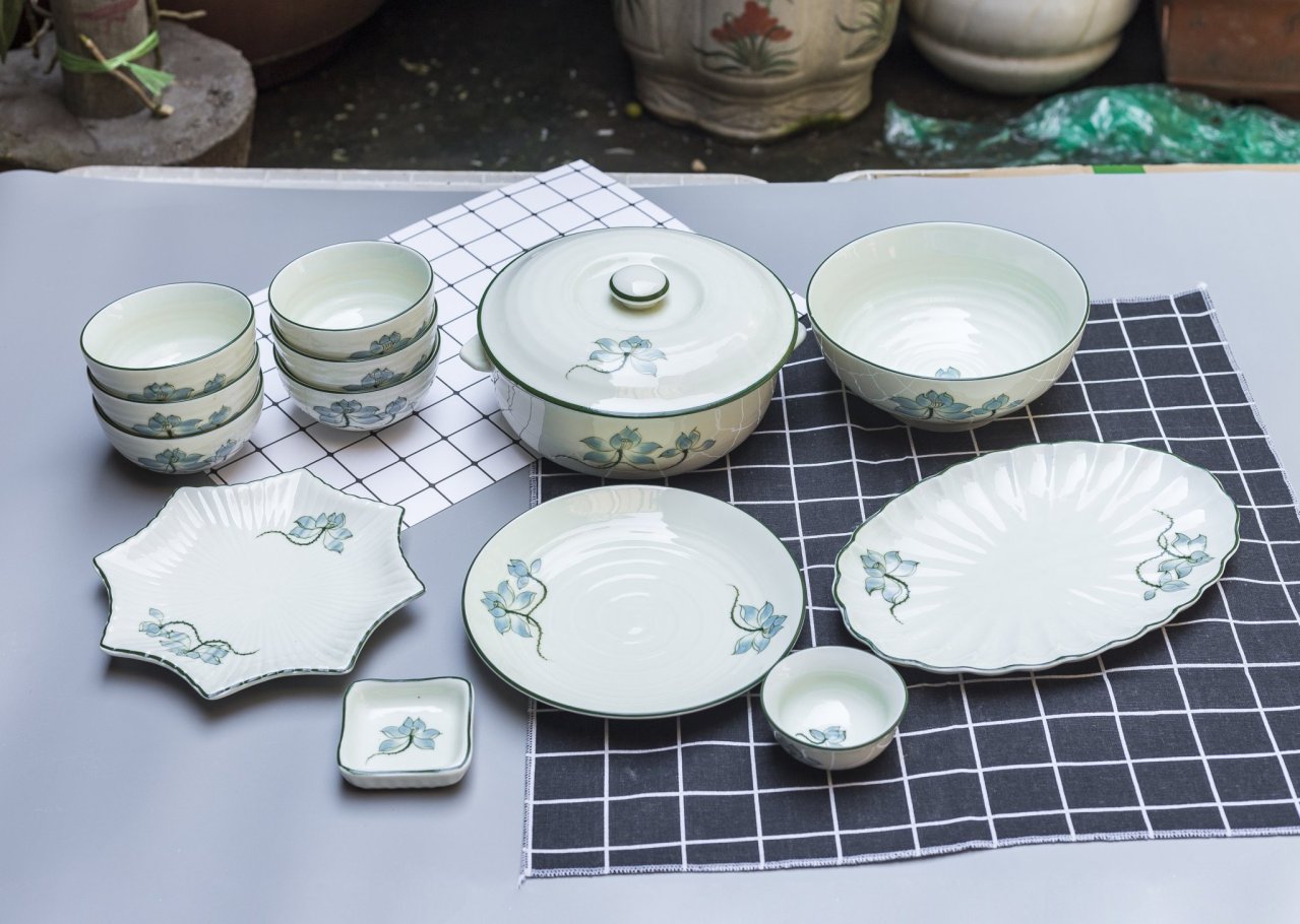 Bộ bát đĩa sứ Sen xanh cao cấp gồm 13 sản phẩm: