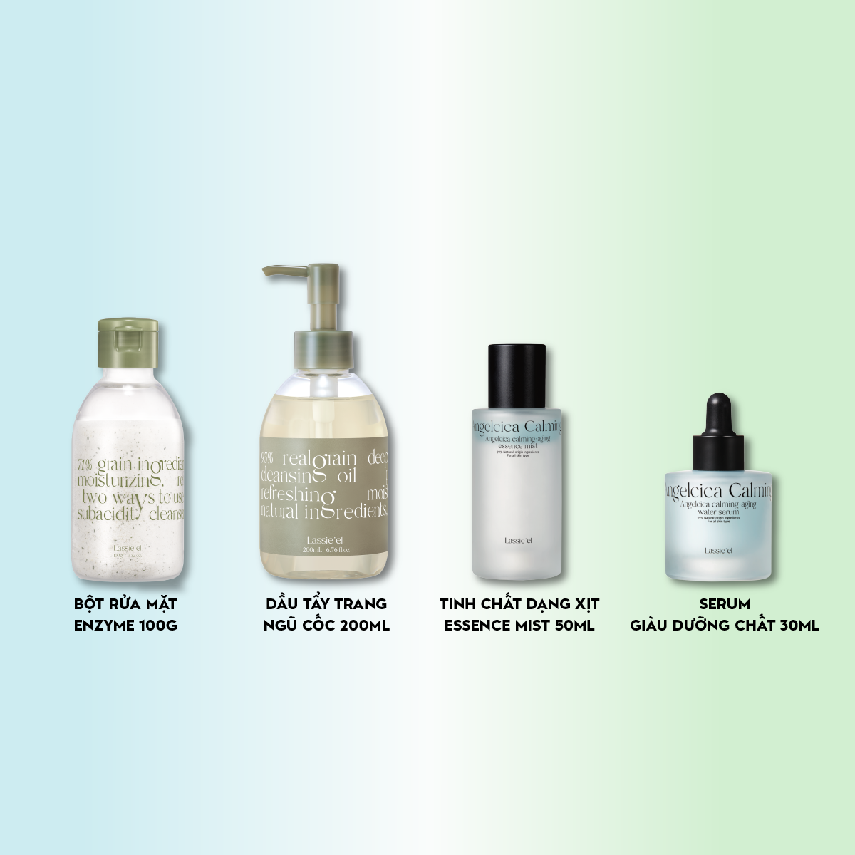 ● Bột rửa mặt và tẩy tế bào chết hằng ngày enzyme Lassie'el: Làm sạch sâu, ẩm mịn, lành tính.