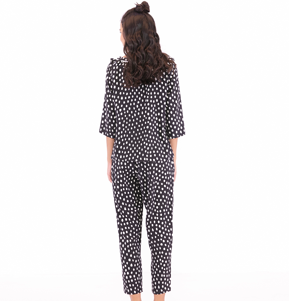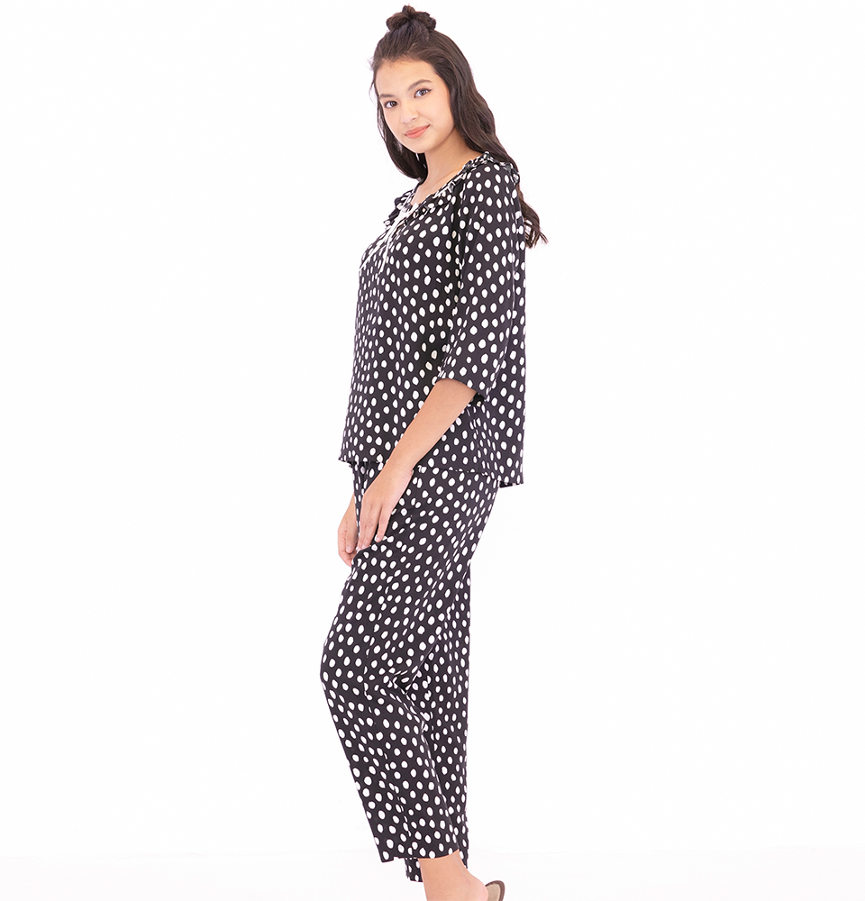 Bộ mặc nhà màu trắng họa tiết chấm bi, tay dài, quần dài, tạo sự kín đáo, vẫn giữ được nét đẹp nhẹ nhàng cho người mặc - LA MỘC chất liệu vải SATIN LỤA.