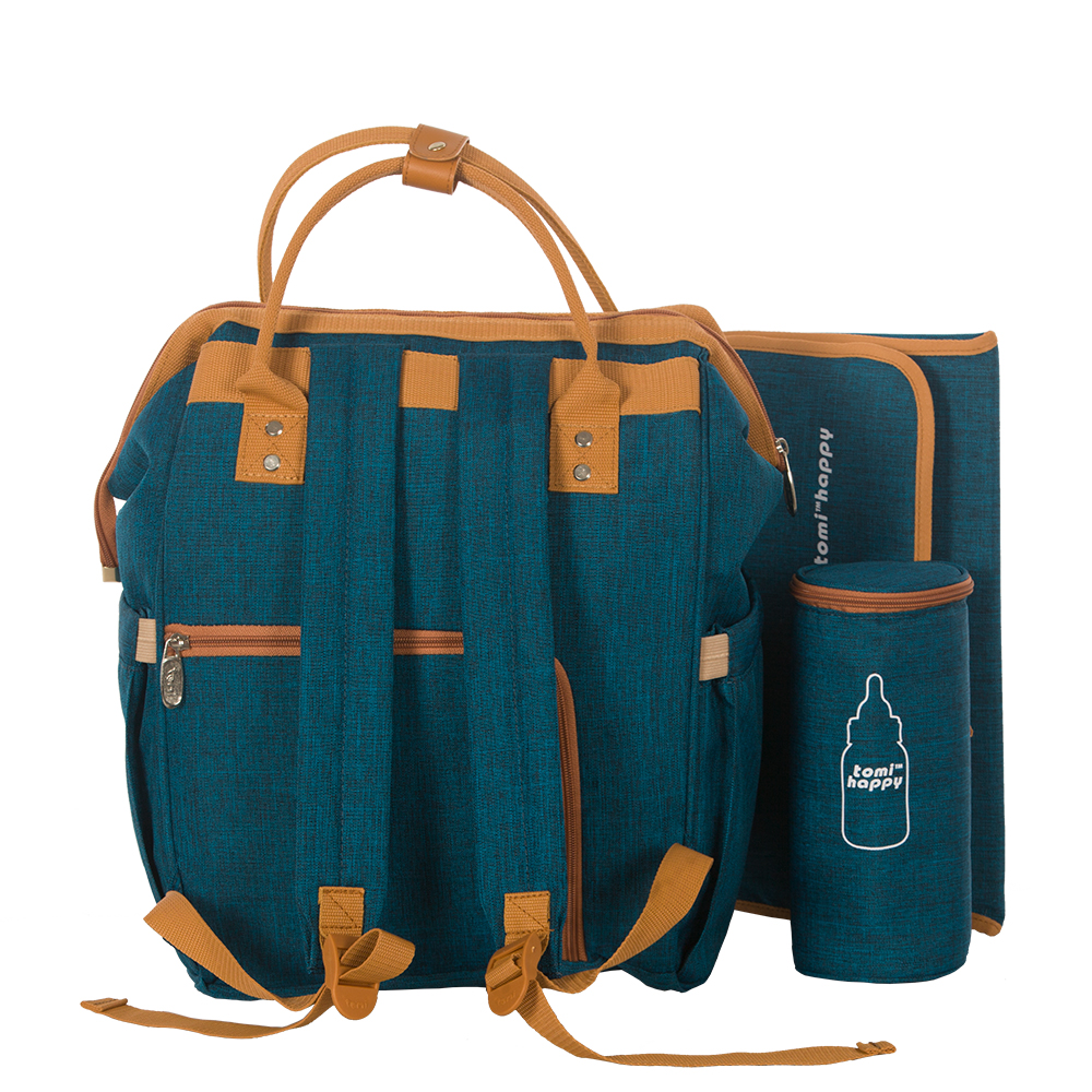Hạnh phúc biết bao sau những tháng ngày chờ đợi, chẳng bao lâu nữa một sinh linh bé nhỏ sẽ xuất hiện - “Bé yêu của Mẹ”. Bao nhiêu thứ phải lo trước thời khắc thiêng liêng này. Một thứ quan trọng không thể thiếu, đó là hành trang cho . Cả Thế giới đang chờ đón thiên thần bé nhỏ, mọi thứ đã sẵn sàng gọn gàng trong một chiếc Túi xách để cung phụng thiên thần. Bao tình thương của mẹ đều hướng về bé yêu. “ình hài nhỏ bé như thiên thần” trong bản nhạc Nhật ký của mẹ là ý tưởng để Thế giới túi xách cho ra đời sản phẩm túi mẹ đi sanh với tên gọi Tomi happy Mom’s Diary. Một chiếc túi đa năng, tiện ích đầy đủ và thật đẹp, rất thích hợp để chứa đủ vật dụng chăm sóc cho nhi thần của Mẹ khi mới chào đời. Túi có dung tích khá lớn và đa năng, tiêu chuẩn an toàn châu Âu, tha hồ chứa khăn, tã, hộp sữa, bình nước, khăn giấy  và đủ các vật dụng khác cho cả mẹ & bé.     Ngăn chính với miệng túi là khóa kéo chuẩn, mở rộng bằng đáy túi, có khung thép bọc kỹ bên trong, để dễ dàng khi xếp vào hoặc lấy đồ ra. Bên trong thành túi còn có nhiều nhăn nhỏ hơn, tiện lợi cho việc sắp xếp, phân loại đồ cho trẻ. Ngoài ra còn có móc dây để treo vật dụng nhỏ riêng biệt bên trong.   Ngăn hộp trước lớn, có thể để 3 bình sữa và nước tiêu chuẩn.   2 ngăn hông lớn để đựng vật dụng như gói khăn giấy khô hoặc ướt, trong đó 1 ngăn có khe để rút khăn mà không phải tháo cả hộp ra.   Phía sau túi còn một có một ngăn khóa kéo kiểu bán mở để thao tác lấy nhanh vật dụng ở dưới đáy túi từ phía sau. Quai xách tay chắc chắn có thể móc vào xe đẩy và quai đeo lưng như balo, thuận tiện vừa bế bé, vừa mang túi.   Túi đính kèm 2 phụ kiện: Đó là  tấm đệm lót tiêu chuẩn thay tã (bỉm) bằng chất liệu không thấm nước khá êm ái với lưng bé; 1 hộp giữ nhiệt để ủ bình sữa hoặc bình nước với 2 lớp mút và giấy bạc giữ nhiệt bên trong. Chất liệu chính từ vải Polyester tráng phủ PU rất thân thiện với da em bé, đặc biệt thiết kế theo tiêu chuẩn tiện ích châu Âu trên nền twoton 4 mầu tươi sáng:  Xanh mạnh mẽ, Hồng dịu dàng, Cam nồng nàn, và Tím thời trang, sẽ là sự lựa chọn tốt nhất cho các Mẹ, và cả những “ông Bố Number One”.