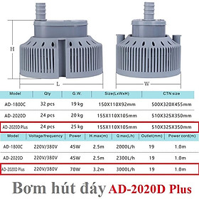 Máy bơm chìm hút đáy công suất 85w Dùng động cơ mạnh mẽ nhưng chạy rất êm với động cơ sử dụng 100% dây đồng mới. Bơm từ không chổi than có thể hoạt động 24/7 phù hợp cho hồ cá, quạt hơi nước công nghiệp, làm mát máy công cụ ... Thông số kỹ thuật: Thân máy bằng nhựa ABS rất chắc chắn giúp nâng cao tuổi thọ của máy. Chân đế cao su dạng hít giúp máy cố định không bị trơn trượt. Đầu ra ren trong phi 19mm và có sẵn đầu chuyển đuôi chuột phi 19m, 22m để Bạn dễ dàng nối với ống mềm. Quai xách tiện lợi Động cơ có công suất 85w nên lực Bơm rất mạnh với lưu lượng tối đa 3.8m3/h và đẩy cao tối đa 3.8m, đầu vào ren trong 19mm Bơm hút đáy nên hút được tối đa so với bơm hút ngang Dây điện dài 1.3m giúp bạn vươn tới nhiều vị trí Ngoài ra chúng tôi còn có các model khác để Quý khách lựa chọn Sản phẩm mới 100% bảo hành 6 tháng nguyên hộp.