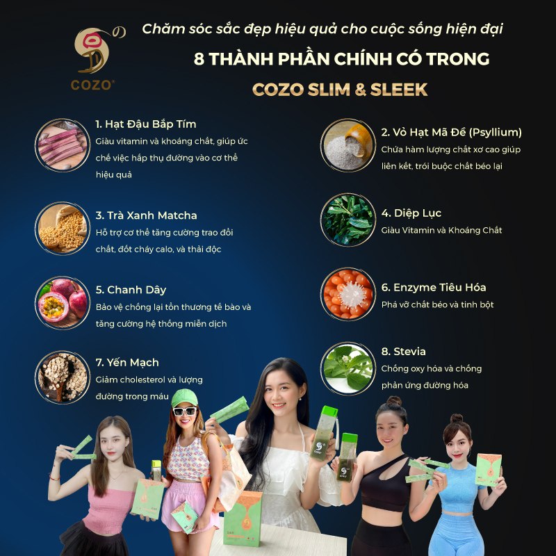 Bột Uống Hỗ Trợ Giảm Cân, Đốt Mỡ, Phân Hủy Chất Béo, Giảm Carbohydrate Cozo Slim & Sleek An Toàn Cho Dạ Dày - Hộp 15 Gói Giải quyết vấn đề đường ruột với Cozo