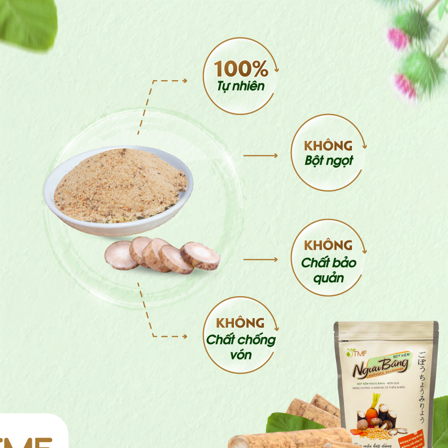 Bột nêm Ngưu Báng – Món quà mang hương vị đậm đà từ thiên nhiên. Thành phần: muối, ngưu báng, nấm đông cô, cà rốt, protein đậu nành, chiết xuất lúa mạch, đường vàng. Bột