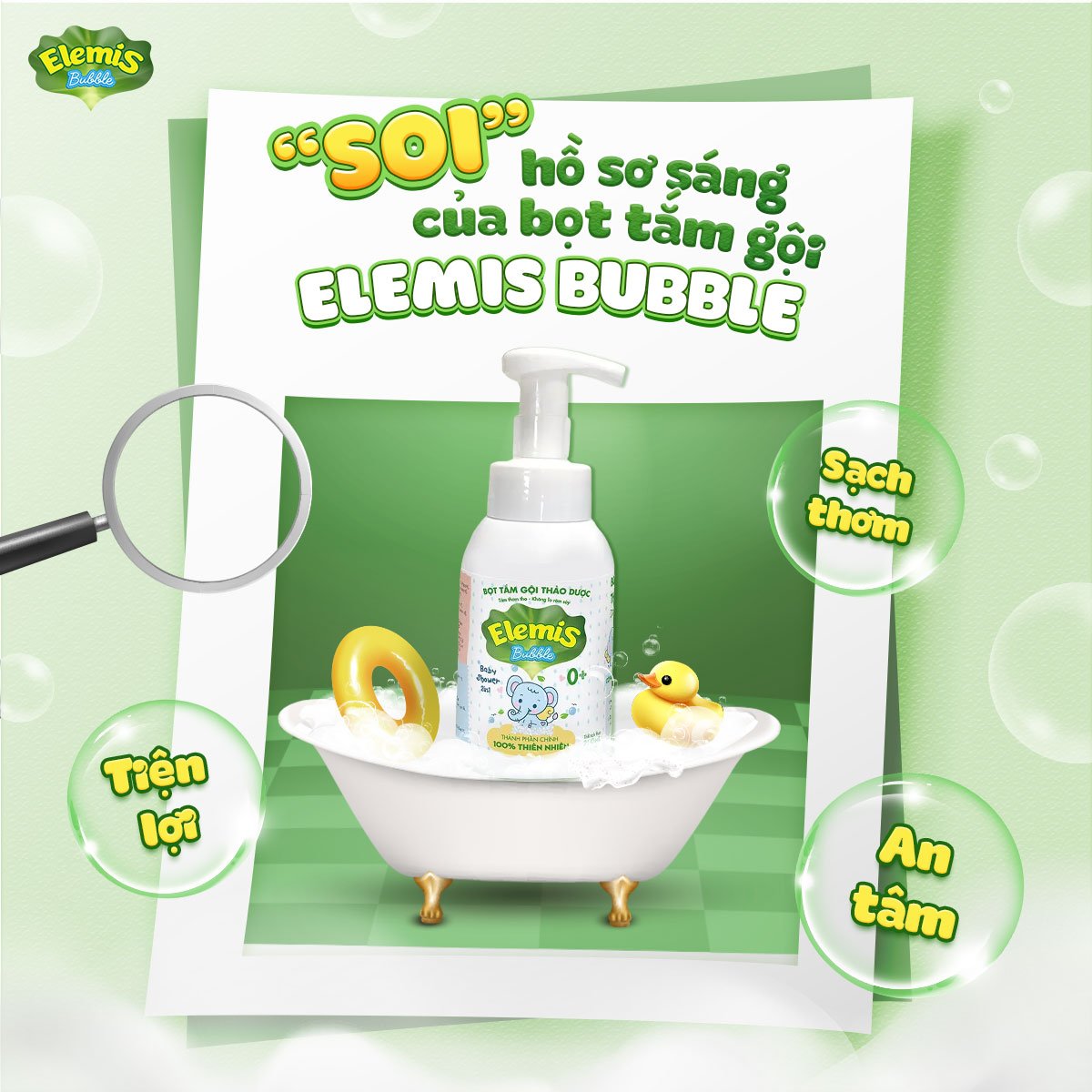Bọt tắm gội thảo dược Elemis Bubble với các chiết thảo dược thiên nhiên từ Đu đủ, Ngải cứu, tinh dầu Màng tang, tinh dầu Mùi, tinh dầu Tràm gió, tinh dầu Sả chanh. Bọt tắm gội thảo dược Elemis Bubble có tác dụng làm sạch, dưỡng ẩm và bảo vệ bé trước các vấn đề về da thường gặp như rôm sảy, hăm tả, mẩn ngứa, mụn nhọt… Thành phần Thành phần thiên nhiên: Chiết xuất Papain từ Đu đủ Chiết xuất Ngải cứu (Artemisia princeps extract) Chiết xuất tinh dầu Màng tang (Litsea cubeba oil) Chiết xuất tinh dầu Mùi (Coriandrum sativum oil) Chiết xuất tinh dầu Tràm gió (Melaleuca cajuputi oil) Chiết xuất tinh dầu Sả chanh (Cymbopogon flexuousus oil) Chiết xuất Diệp lục tố (Chlorophyll) Thành phần đầy đủ: Berberin nano, Aquaxyl, Glycerin, Tween 80, Natri benzoat, Betain, Triethanolamin, HPMC E6 (Hydroxypropyl methylcellulose), SLES (Sodium lauret ether sulfat), Transcutol, PEG 4000, Acid citric, Nước tinh thiết. Công dụng Làm sạch và bảo vệ da, giúp da bé khỏe mạnh. Hỗ trợ kháng khuẩn, phòng chống rôm sẩy, làm dịu vết hăm nẻ, hăm tả, giảm mụn nhọt. Dưỡng ẩm tự nhiên, chống khô da, giúp da bé luôn mềm mại, thơm mát. Hướng dẫn sử dụng Bước 1: Làm ướt tóc và cơ thể bé bằng nước ấm. Bước 2: Nhấn 2-3 lần bọt mịn ra tay, rồi xoa nhẹ nhàng toàn cơ thể bé để làm sạch. Bước 3: Tắm gội lại với nước ấm. Sử dụng hàng ngày cho bé để đạt được kết quả tốt nhất. Đối tượng sử dụng Trẻ sơ sinh và trẻ nhỏ.