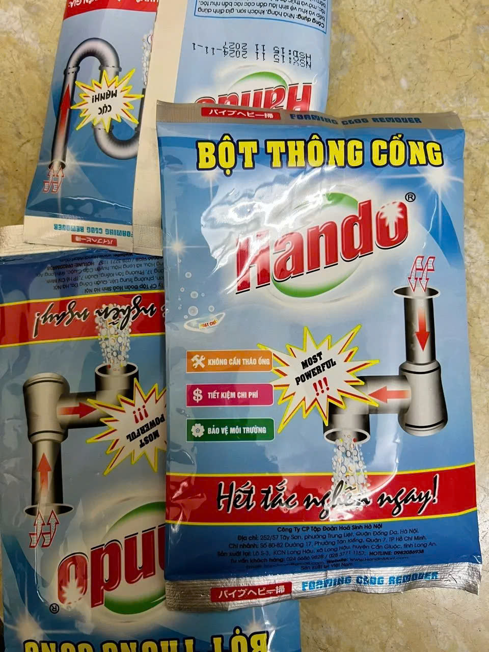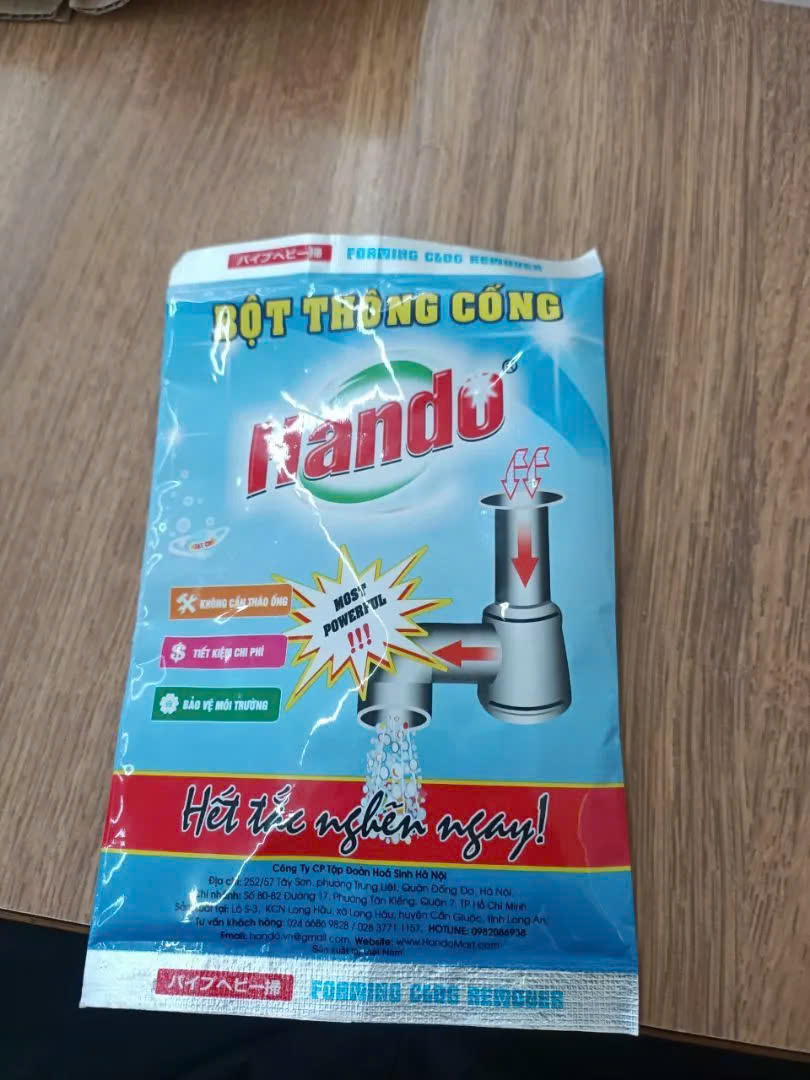 THÔNG TIN SẢN PHẨM Tên sản phẩm: Thông tắc đường ống cống, lavabo, bồn rửa chén, bồn cầu Hando 100g (gói bột) Công dụng: Thông tắc đường ống thoát nước, bồn rửa chén, lavabo, bồn