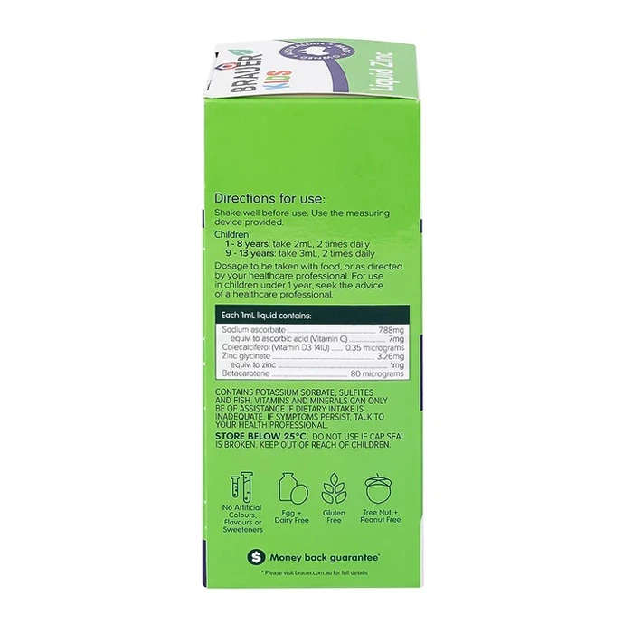 Cung cấp lượng kẽm cần thiết cho sự phát triển của trẻ Brauer Liquid Zinc là thực phẩm bảo vệ sức khỏe được nhập khẩu nguyên hộp từ Úc. Sản phẩm gồm kẽm kết hợp với vitamin C và vitamin D3, giúp tăng cường sức đề kháng cho trẻ.