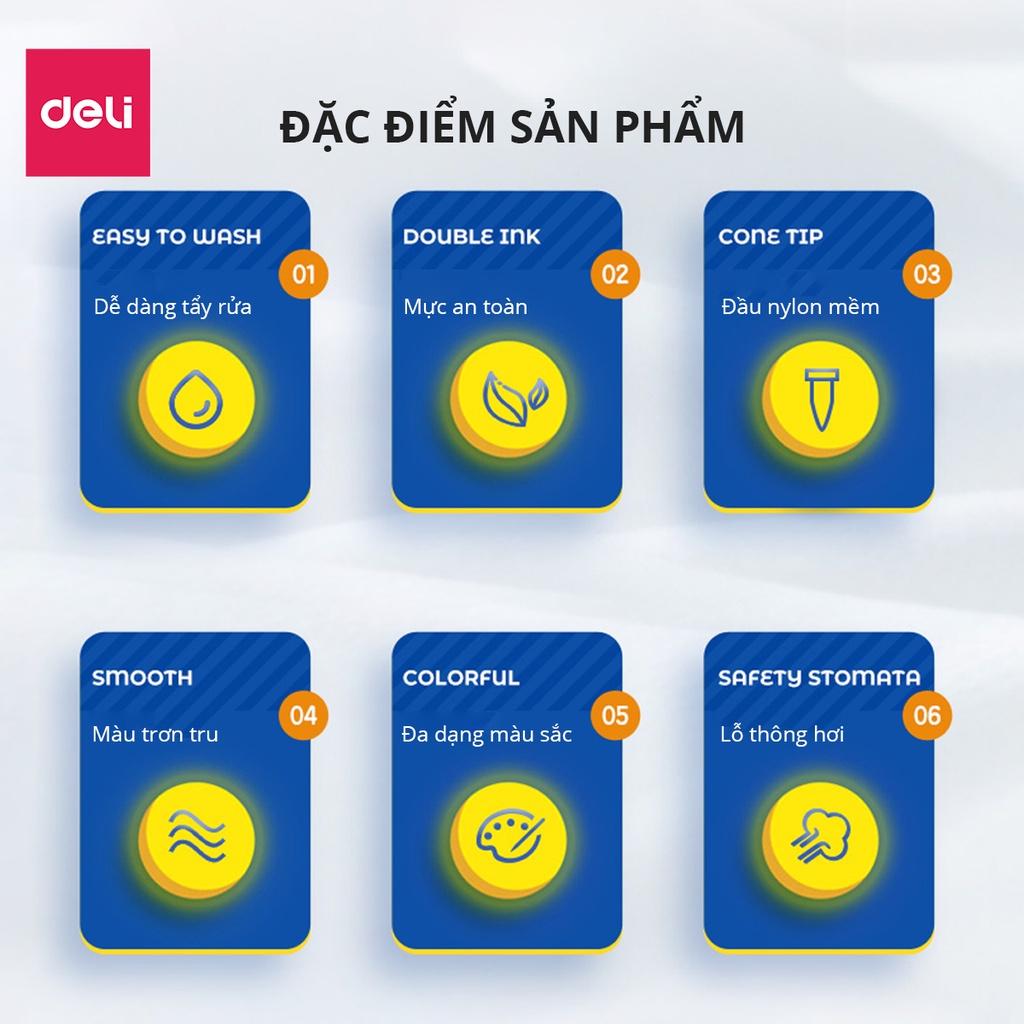 BÚT MÀU DẠ NƯỚC 2 ĐẦU DELI - ĐẦU CỨNG - MỀM - KÈM HỘP NHỰA TÍNH NĂNG SẢN PHẨM: ️Đi kèm hộp nhựa chắc chắn có quai cầm ️Màu sắc tươi sáng, đều