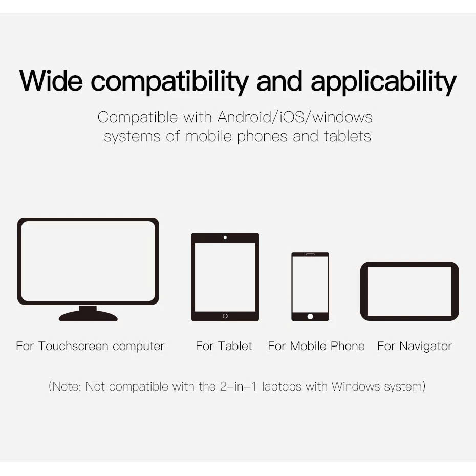 Chiếc bút cảm ứng dùng cho mọi màn hình cảm ứng điện dung. Tương thích tốt với tất cả các smartphonee và tablett hiện này từ Android cho đến iOSs. (Lưu ý: Không tương thích với máy tính bảng 2 in 1 của hệ điều hành Windows)