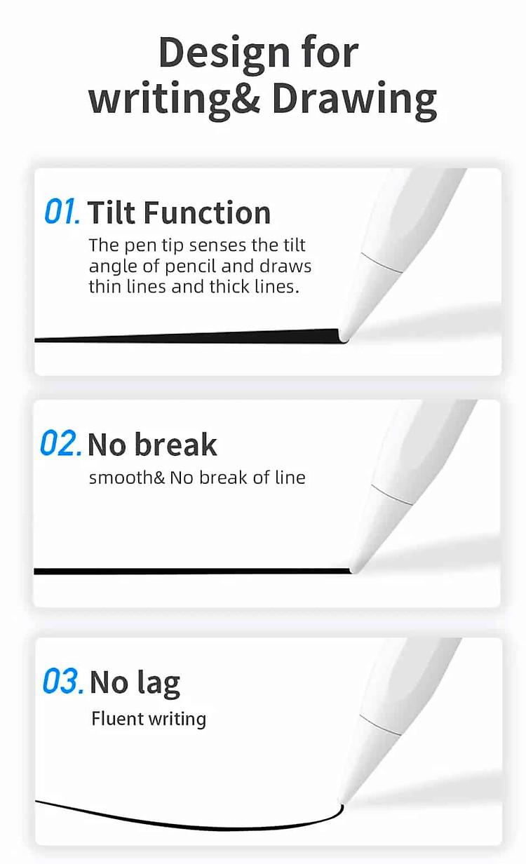 Bút stylus cho iPad có độ nhạy nghiêng và chức năng làm dày được thiết kế để hoạt động như một cây bút chì thông thường, cho phép bạn vẽ các nét có độ dày và độ sâu khác nhau bằng cách thay đổi độ nghiêng của đầu bút, hoàn hảo để vẽ, phác thảo và ghi chú trên iPad.