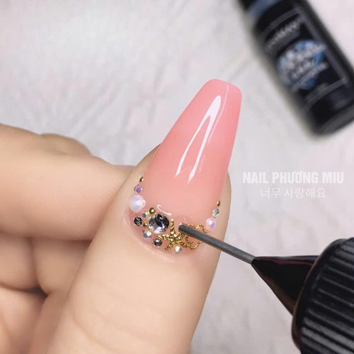 - Bước 5: Kiểm tra lại độ bám của charm, nếu cần có thể chấm thêm một lớp gel mỏng để gia cố. Lý do nên chọn bút đính đá Vinimay dạng gel 15ml