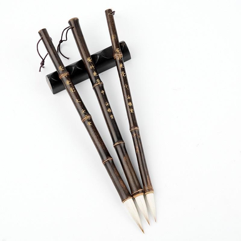 Combo bộ bút vẽ thuỷ mặc cơ bản gồm 4 cây. Cây to (kiêm hào lông hỗn hợp) vẽ lá sen, núi, thân gỗ gồ ghề. Cây lông nâu (lang hào) vẽ thân trúc, lá