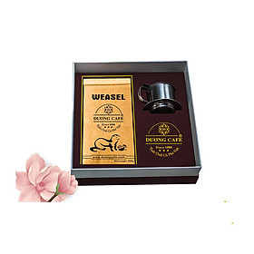 SẢN PHẨM GỒM: - 1 hộp quà: túi cà phê chồn 500g + 1 phin cafe màu anod đẹp - 1 hộp cà phê chồn phin giấy (10 túi x 15g) - 1 hộp cà
