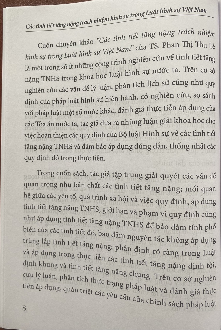 Giới thiệu cuốn sách ; Các tình tiết tăng nặng trách nhiệm hình sự trong Luật hình sự Việt Nam (Sách chuyên khảo) Tác giả: TS. Phan Thị Thu Lê Năm xuất bản: 2022 Số