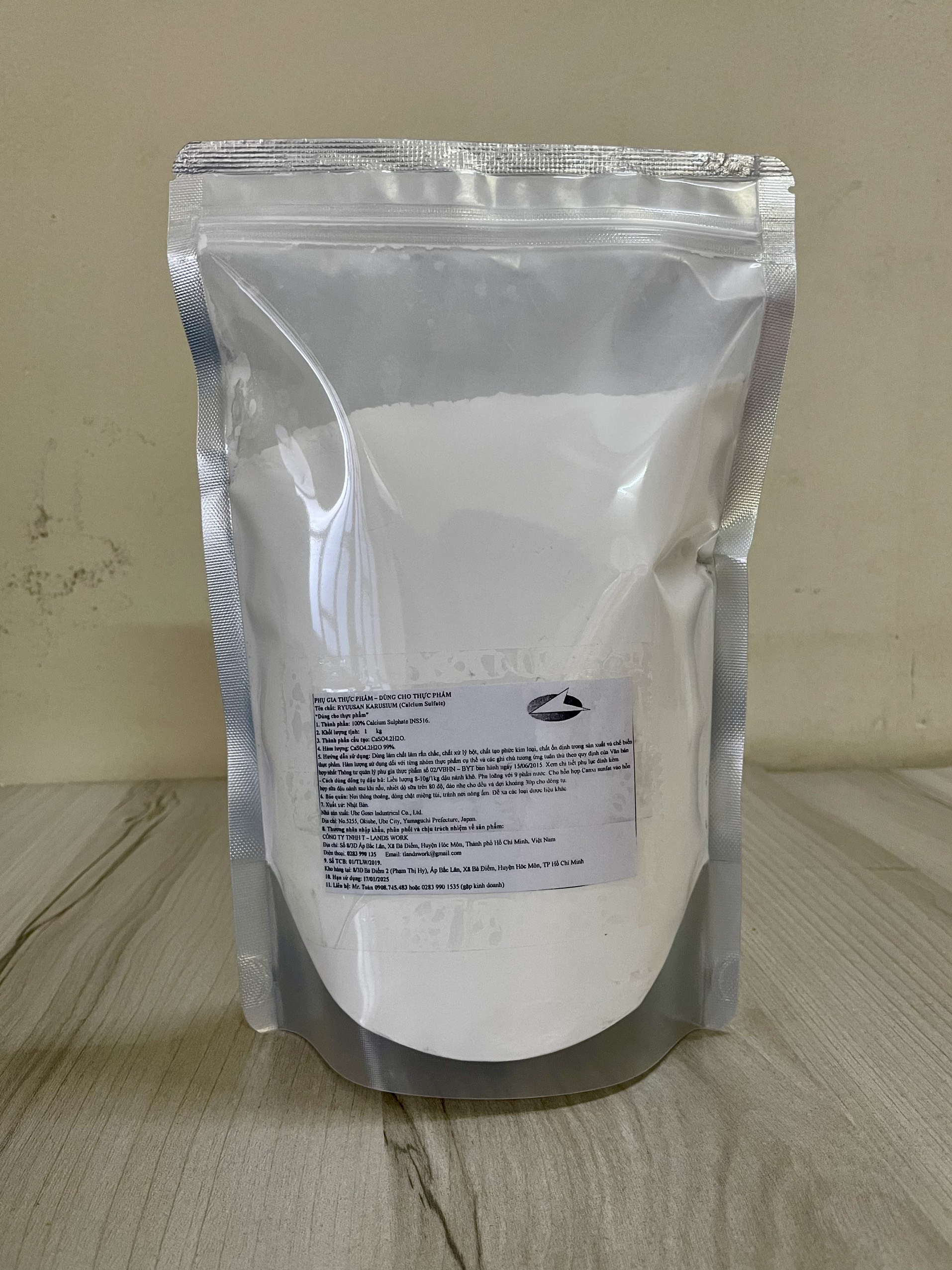 Calcium sulfate Nhật Bản thạch cao tinh khiết 99% dùng trong thực phẩm 1kg Tên thường gọi : Thạch cao Nhật, thạch cao tinh khiết, thạch cao thực phẩm, thạch cao làm đậu hũ, canxi sunfat, calci Tên khoa học : RYUUSAN KARUSIUM (Calcium sulfate) Thành phần : 100% Calcium sulfate (INS 516) Thành phần tinh khiết : Hàm lượng CaSO4.2H2O tinh khiết trên 99,60% Công thức hoá học : CaSO4.2H2O Ngoại quan : Màu trắng, dạng bột rất mịn, tan nhanh trong nước nóng,không mùi. Quy cách đóng gói : Túi zip 1kg chiết từ bao 15kg Mục đích : Dùng làm chất ổn định trong sản xuất thực phẩm (đậu hũ, đậu phụ, bia, nước ngọt, nước giải khát, sữa, làm bá) Công dụng đối với đậu hũ : Tạo đông đậu hũ, đậu phụ, bổ sung khoáng chất cho cơ thể Tên nhà sản xuất : UBE GOSEI INDUSTRICAL CO., LTD. Địa chỉ : No.5255, Okiube, Ube City, Yamaguchi Prefecture, Japan Sản xuất tại : Nhật Bản Mục đích: Làm đậu phụ miếng, đậu phụ chiên, hoặc đậu hũ non. Ưu điểm: Dễ làm, đậu phụ kết đông nhanh. Miếng đậu cho hậu vị ngọt, béo. CÁCH DÙNG CANXI SUNFAT (THẠCH CAO) TẠO ĐÔNG ĐẬU HŨ (ĐẬU PHỤ)