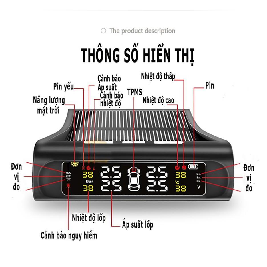 - Tính năng của sản phẩm cảm biến áp suất lốp – Không phải trực tiếp ra ngoài tận mắt kiểm tra nữa! – Thiết bị cảnh báo áp suất lốp sẽ thông báo thường xuyên áp suất lốp của từng chiếc bánh xe cho bạn ngay cả khi bạn đang di chuyển xe trên đường. – Chạy bằng năng lượng mặt trời – Thiết bị cảm biến áp suất và nhiệt độ lốp TPMS thông minh này sẽ có cảnh báo bằng âm thanh và hình ảnh tới bạn mỗi khi áp suất lốp quá thấp < 1,7 Bar hoặc > 3,3 Bar hoặc nhiệt độ lốp > 70*C – Có cảnh báo âm thanh – Chạy bằng năng lượng mặt trời – Tự lắp đặt tại nhà! Chỉ việc vặn 4 nắp van vào 4 lốp xe của mình là xong và dùng ốc đảo chiều xiết chặt sản phẩm lại để đảm bảo không bị rơi rớt.