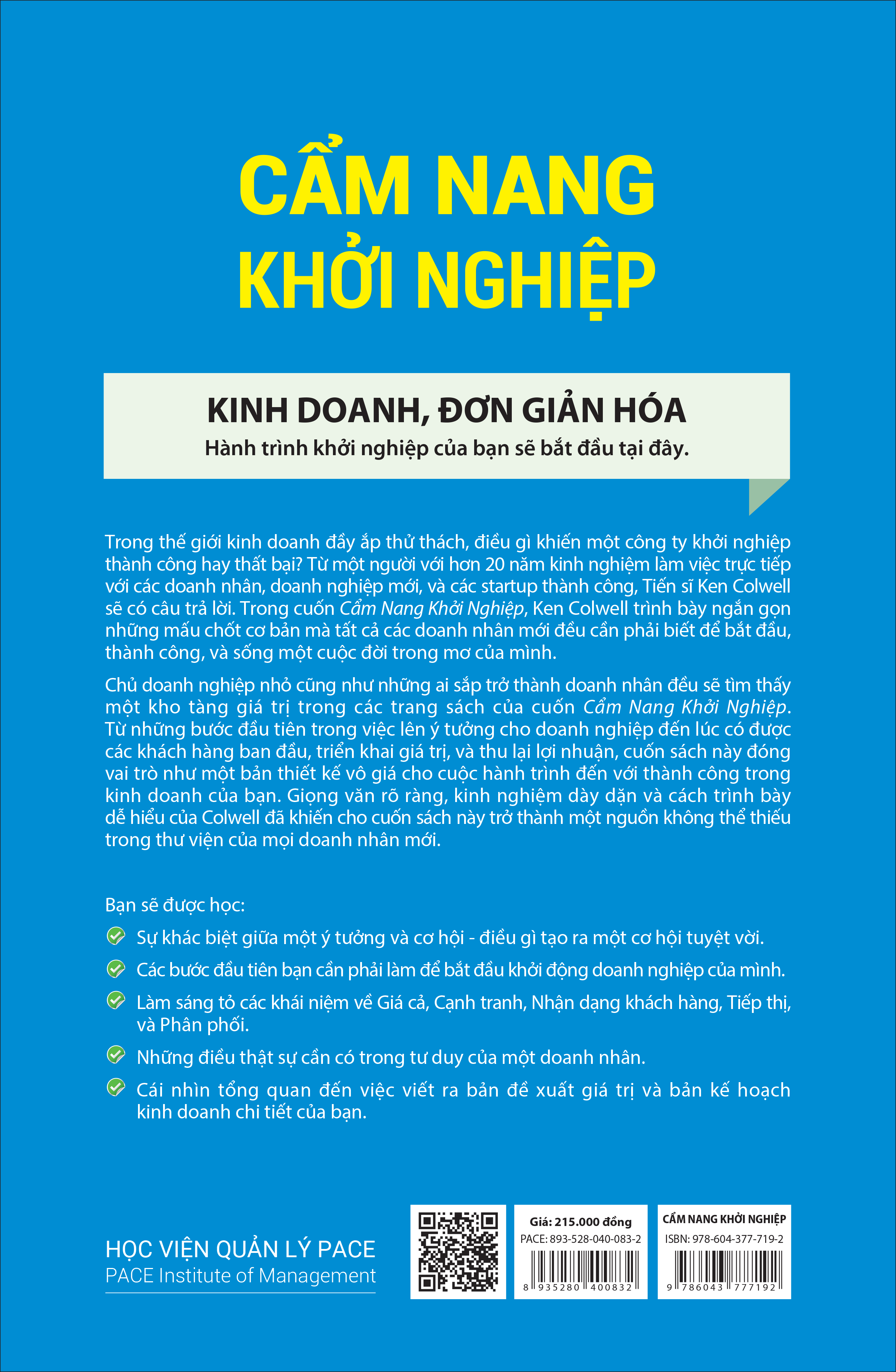CẨM NANG KHỞI NGHIỆP (Starting a Business: Quickstart Guide) - (bìa mềm) - Giá bìa: 215.000 đ Tác giả: Ken Colwell Dịch giả: Hoàng Thảo Ly Nhà xuất bản: NXB TỔNG HỢP Nhà phát hành: PACE Books