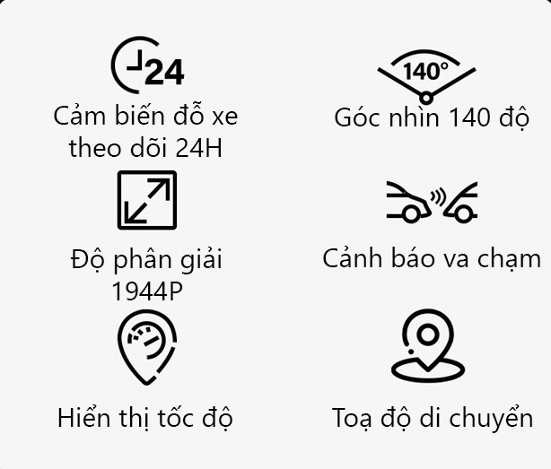 Độ phân giải video : 2K 1440P Ống kính : Camera trước 150° Ghi hình vòng lặp : Có Wifi : Có GPS : Có Công nghệ hình ảnh giảm nhiễu Hỗ trợ tái hiện