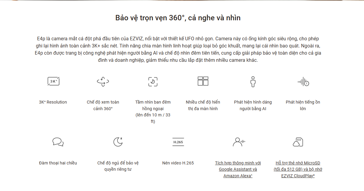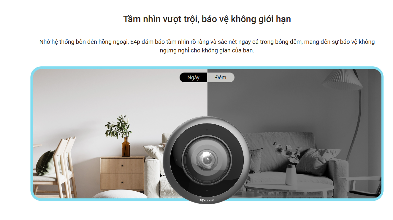 Camera hỗ trợ chế độ xem cận cảnh PiP và chia màn hình đa góc. Bạn có thể chọn chế độ toàn cảnh hoặc tập trung vào khu vực cụ thể. Ứng dụng EZVIZ cho phép điều chỉnh góc nhìn dễ dàng. Tính năng này giúp giám sát linh hoạt, tiện lợi.