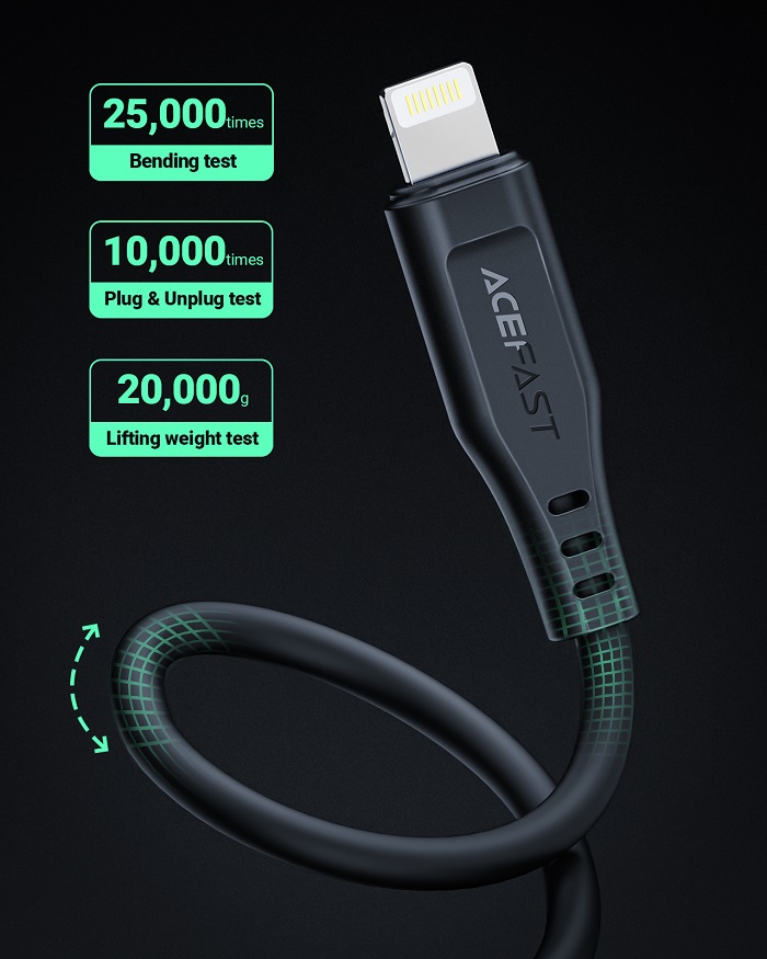 Cáp ACEFAST C3-02 , dòng điện lên đến 2,4A, chiều dài 1.2m, chất liệu TPE, chứng nhận M.F.I Thông số kỹ thuật: - - Chiều dài: 1.2m. Trọng lượng: 30g. - - Chất liệu vỏ bên ngoài: