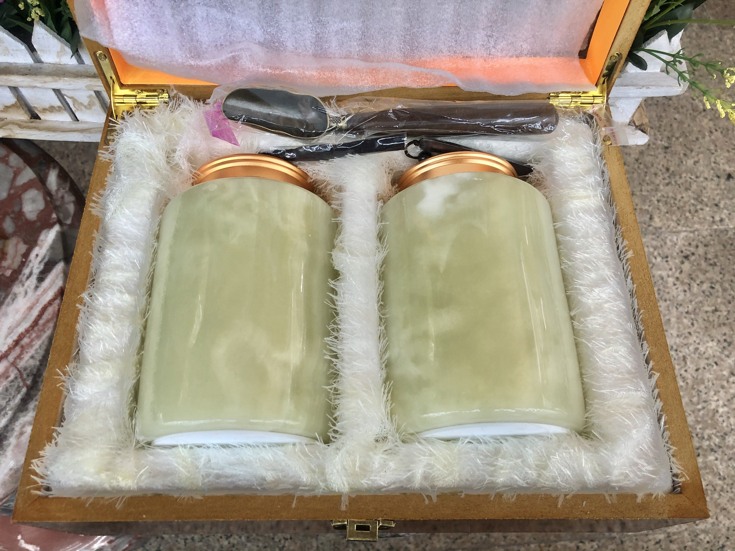 Chất liệu: Đá ngọc Onyx Kích thước: Cao 15 cm Khối lượng: 3,8 kg/ bộ Bộ sản phẩm gồm: 2 hủ đựng, 1 muỗng và 1 hộp đựng cao cấp. Cách dùng: Dùng để đựng
