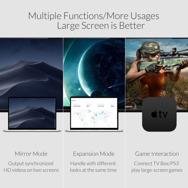 1. 8K resolution support at 60Hz and 4K resolution support at 120Hz for high-definition video and audio. 2. HDR (High Dynamic Range) support for improved color depth, contrast, and brightness. 3. Plug-and-play design, no additional