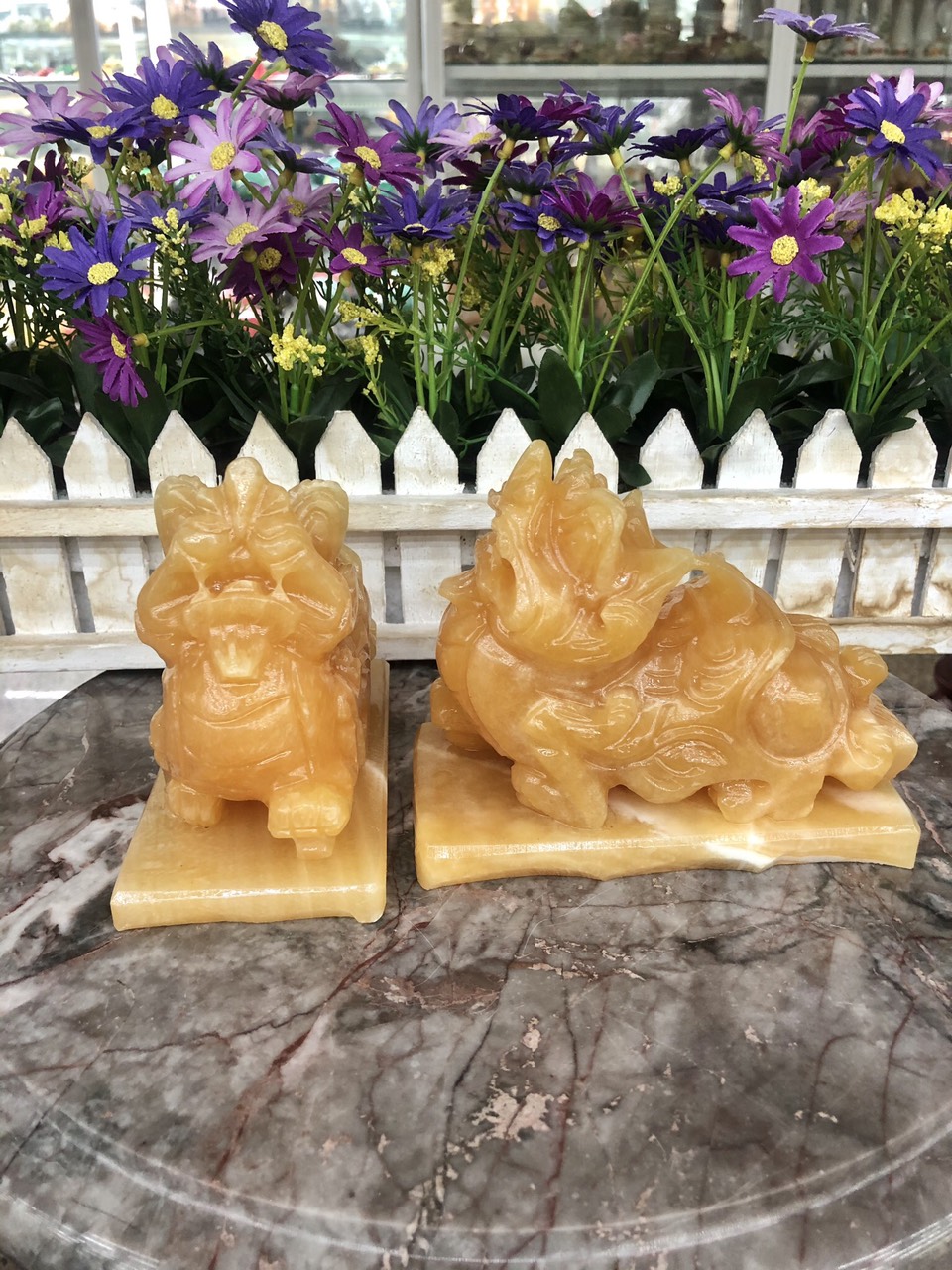 Hợp mệnh Thổ - Kim Chất liệu: Đá cẩm thạch vàng cà rốt Kích thước: Dài 15 cm X Rộng 6 cm x Cao 12,5 cm Khối lượng: 3,2 kg / cặp Ý nghĩa Tỳ