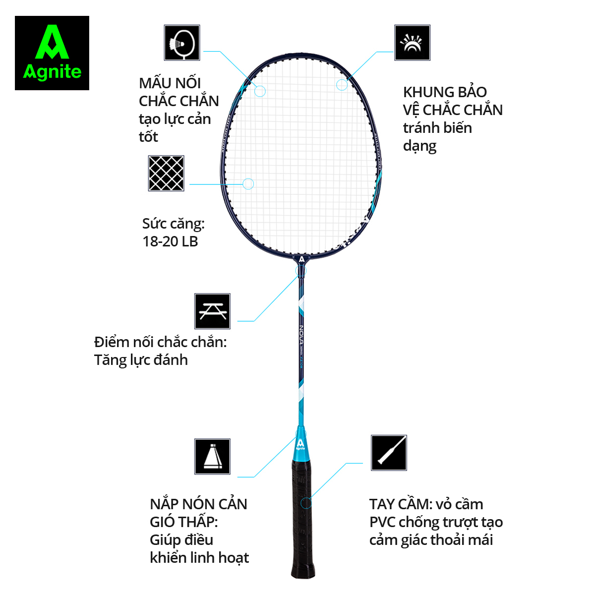 THÔNG SỐ CƠ BẢN Thương hiệu: Agnite Mã số: F2108 Số lượng: Hai chiếc Màu sắc: xanh lam + đỏ Trọng lượng vợt: 110 ± 5g Độ cứng thanh: cứng Lực căng dây: 16-18LB Chiều