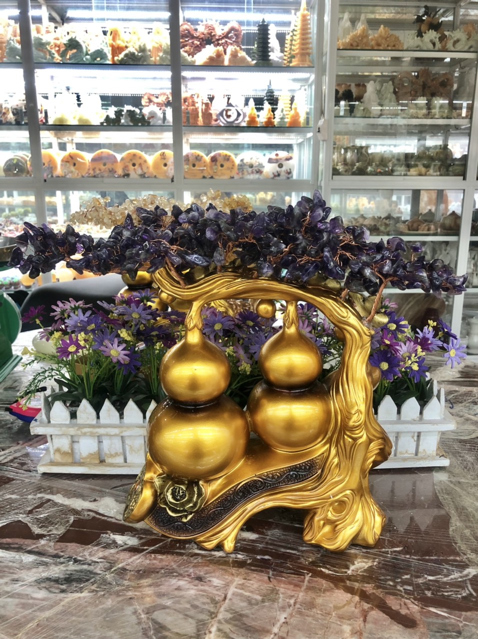 ✨Cây tài lộc bầu hồ lô phong thủy đá thạch anh tím trang trí bàn thờ thần tài, bàn làm việc - Cao 34 cm