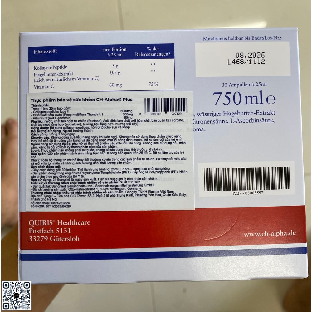 - Địa chỉ tổ chức chịu trách nhiệm sản xuất: Otto-Hahn-Straße 1, 89269 Vöhringen, Germany (Đức) Mô tả sản phẩm CH Alpha Plus là dòng collagen sinh học cao cấp, được nghiên cứu chuyên biệt để hỗ trợ sụn khớp, giúp duy trì độ linh hoạt và dẻo dai cho cơ thể. Công thức chứa Collagen Peptide FORTIGEL đã được kiểm chứng về độ hiệu quả trong việc hỗ trợ sức khỏe xương khớp. Dạng ống uống giúp cơ thể hấp thu nhanh chóng, không cần pha chế, phù hợp với người bận rộn. Lý do nên chọn CH-Alpha Plus Công thức chuyên biệt cho xương khớp và làn da Sản phẩm nhập khẩu chính hãng từ Đức