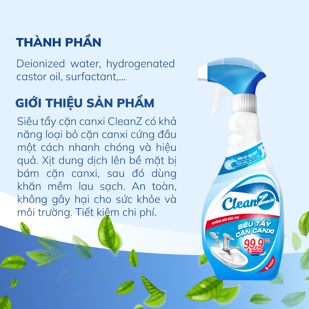 - Sau một thời gian sử dụng những chiếc vòi hoa sen hay bồn inox của bạn đã bắt đầu cáu bẩn,ố vàng. Nước tẩy rửa thông thường cặn canxi không sạch hoặc bị bong hết lớp ngoài cùng nếu vệ sinh không đúng cách. CleanZ loại bỏ các dấu vết của nước và thậm chí cả những mảng bám vôi hóa cũ.