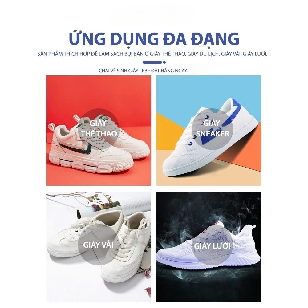 ------------ TÍNH NĂNG NỔI BẬT ------------- CÔNG NGHỆ KHỬ KHUẨN 2 TRONG 1: Làm sạch nhanh và tiêu diệt vi khuẩn, giúp bề mặt giày, dép trở nên trắng sáng trở lại. BỌT SIÊU MỊN, KHÔNG CÓ CẶN: Không vón cục hay để lại cặn như các dòng vệ sinh truyền thống. ĐẦU XỊT TIỆN LỢI: Thiết kế nâng cấp với đầu phun thế hệ mới, cho lượng bọt đều và dễ dàng hơn. BẢO QUẢN BỀ MẶT: Công thức an toàn, không gây ăn mòn hay biến dạng bề mặt. TIẾT KIỆM THỜI GIAN: Không cần giặt, sạch ngay chỉ sau 30s