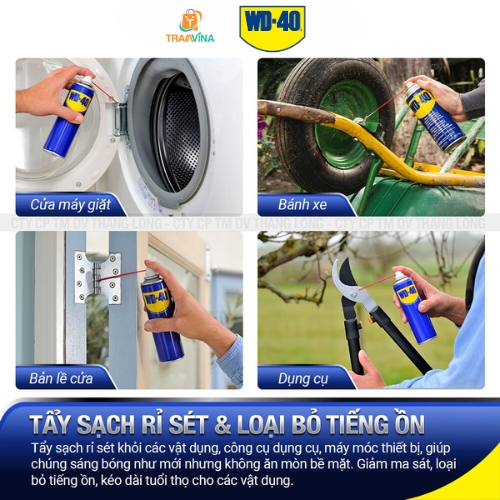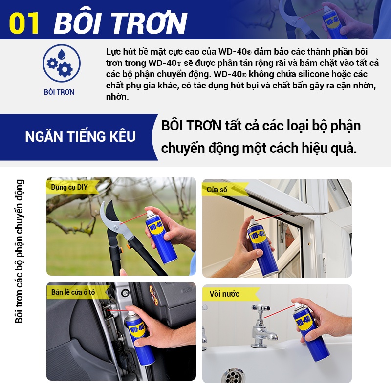 - Chai Xịt Tẩy Rỉ Sét WD 40 Dầu Chống Rỉ Bôi Trơn, Chống Ẩm Đa Năng WD-40 Multi-Use Product còn dùng để vệ sinh xe máy, oto, xe đạp, máy móc công nghiệp, thiết bị điện tử, đồ dùng trong nhà, giày dép bằng da, giúp các bề mặt sạch và sáng bóng hơn.