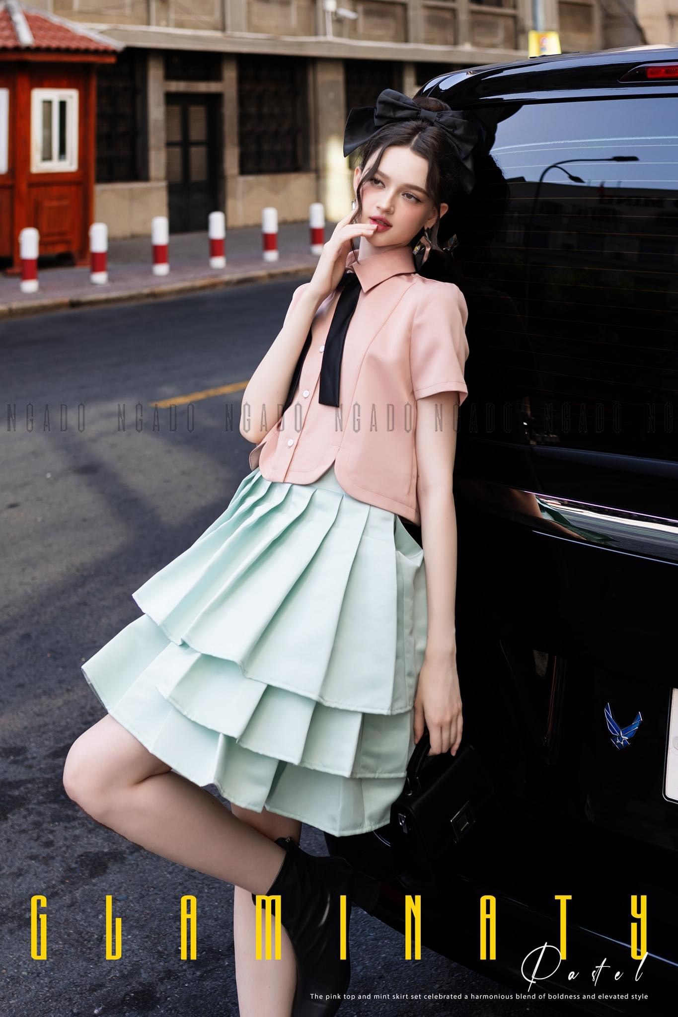 Set áo vest chân váy xếp li siêu hack dáng màu xanh bơ hot của năm (link mua ở bình luận)