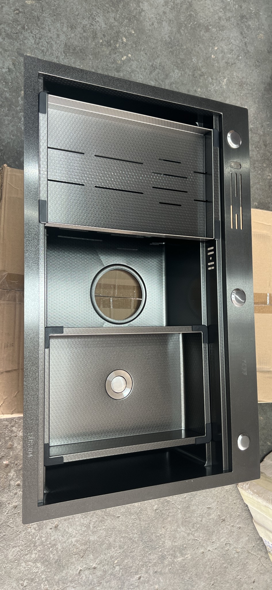 Mua tại TiktokBảo hành: 5 năm Chất liệu: Inox 304 phủ nano đen Độ dày: 1.0 + 3.0 Độ sâu bồn: 240 mm Kích thước: 780D x 480R mm Đóng gói: 1 bộ tiêu chuẩn túi PE, Foam, 2 khay đựng (kèm siphon)