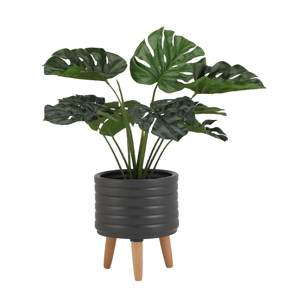 ✨Chậu trang trí bằng sành DEARO hình trụ tròn màu xám đậm kết hợp chân đỡ bằng gỗ, kích thước 28x37cm (RxC) | Index Living Mall - Phân phối độc quyền tại Việt Nam