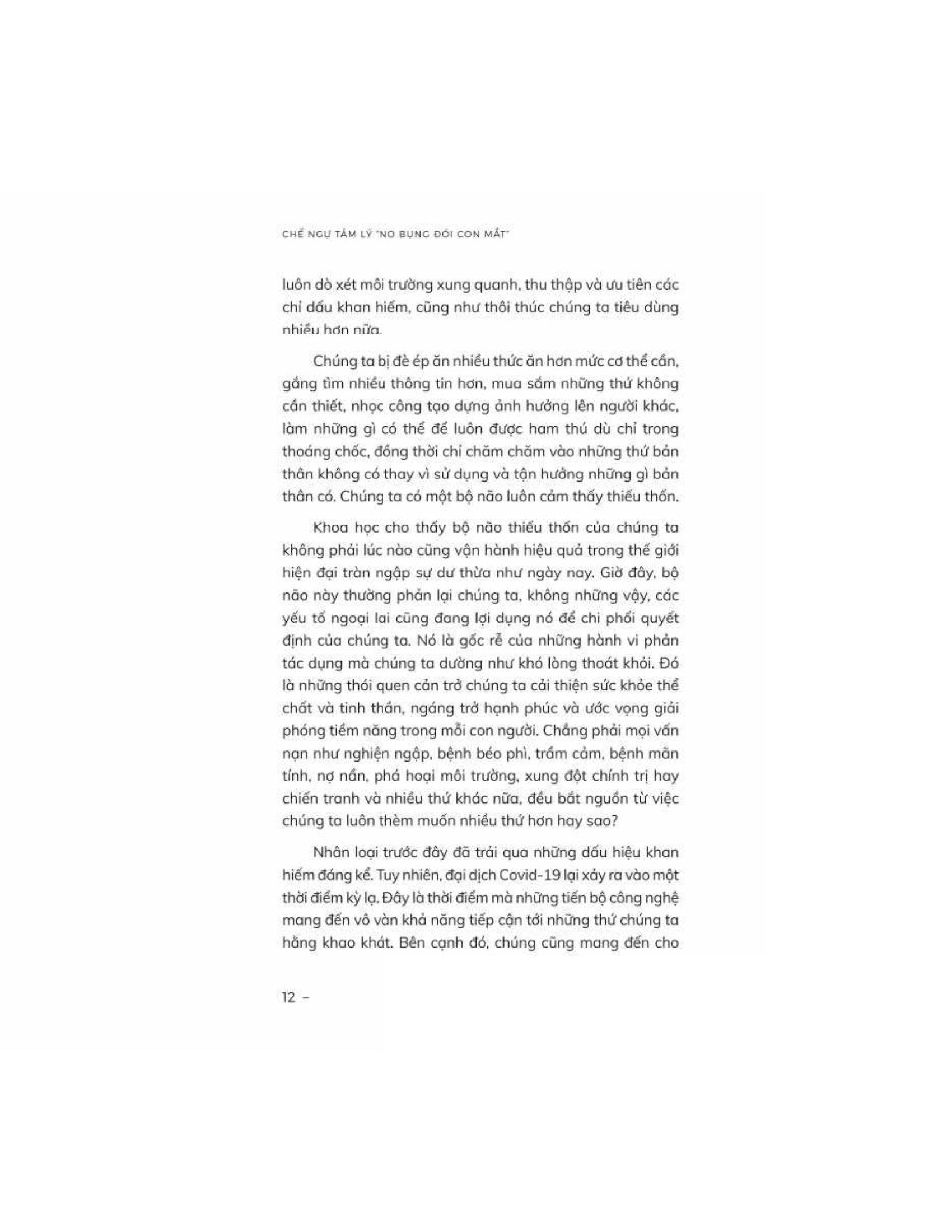 Chế ngự tâm lý “no bụng đói con mắt" của Michael Easter đưa người đọc vào một hành trình kích thích tư duy để tìm hiểu sự phức tạp của tâm trí con người và lý do đằng sau những ham muốn vô độ của chúng ta. Easter khám phá khái niệm về tư duy khan hiếm, "vòng lặp thiếu thốn" - một chu kỳ liên tục khiến chúng ta mong muốn sở hữu nhiều hơn trong các khía cạnh khác nhau của cuộc sống, từ thực phẩm và của cải vật chất đến thông tin cũng như sức ảnh hưởng.