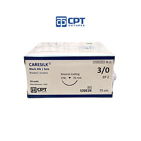 Chỉ phẫu thuật không tiêu Caresilk Silk: size cỡ chỉ: 3/0 USP, dài 75 cm, kim tam giác 3/8c, dài 26 mm, mã hàng: S20E26. Quy cách đóng gói: 24 tép. THÀNH PHẦN: