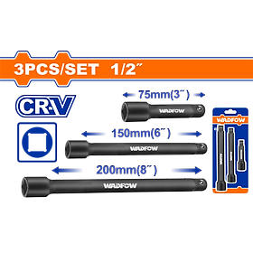 Bộ thanh đầu chuyển đầu tuýp 1/2 inch. Bao gồm: 1 cái thanh đầu chuyển đầu tuýp 1/2 inch, chiều dài 3 inch 1 cái thanh đầu chuyển đầu tuýp 1/2 inch, chiều dài 6 inch 1 cái thanh đầu chuyển đầu tuýp 1/2 inch, chiều dài 8 inch Chất liệu: thép 50BV30 (Cr-V). Ép đùn nguội, Xử lý nhiệt Đóng gói bằng vỉ đôi.