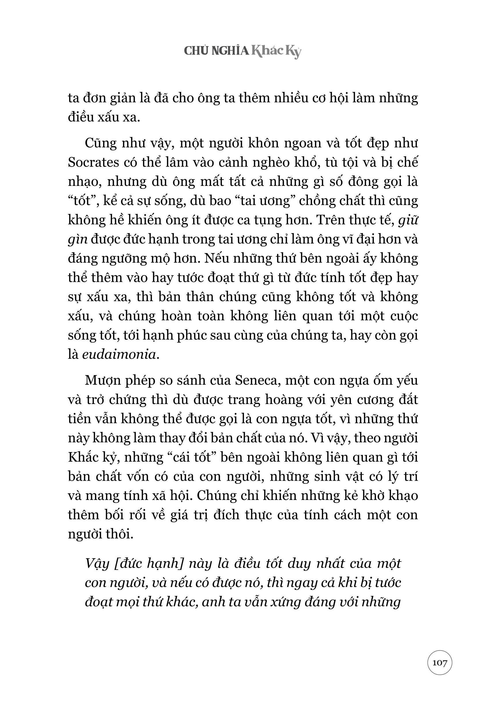 Người Khắc kỷ tin rằng đức hạnh là thứ duy nhất thật sự tốt đẹp, là điều kiện cần và đủ cho một cuộc sống tốt, còn những thứ “ngoại tại” như sức khoẻ, của cải, danh vọng… là “không quan trọng” và nằm ngoài tầm kiểm soát. Tuy nhiên, phân biệt giữa điều nằm trong và ngoài năng lực kiểm soát chính là khía cạnh khó nhằn nhất, dễ nhầm lẫn nhất của thuyết Khắc kỷ. Như Donald Robertson đính chính trong sách, những ấn tượng rằng người khắc kỷ sống khô khan, vô cảm, kìm nén cảm xúc… đều do hiểu sai điểm này của học thuyết.