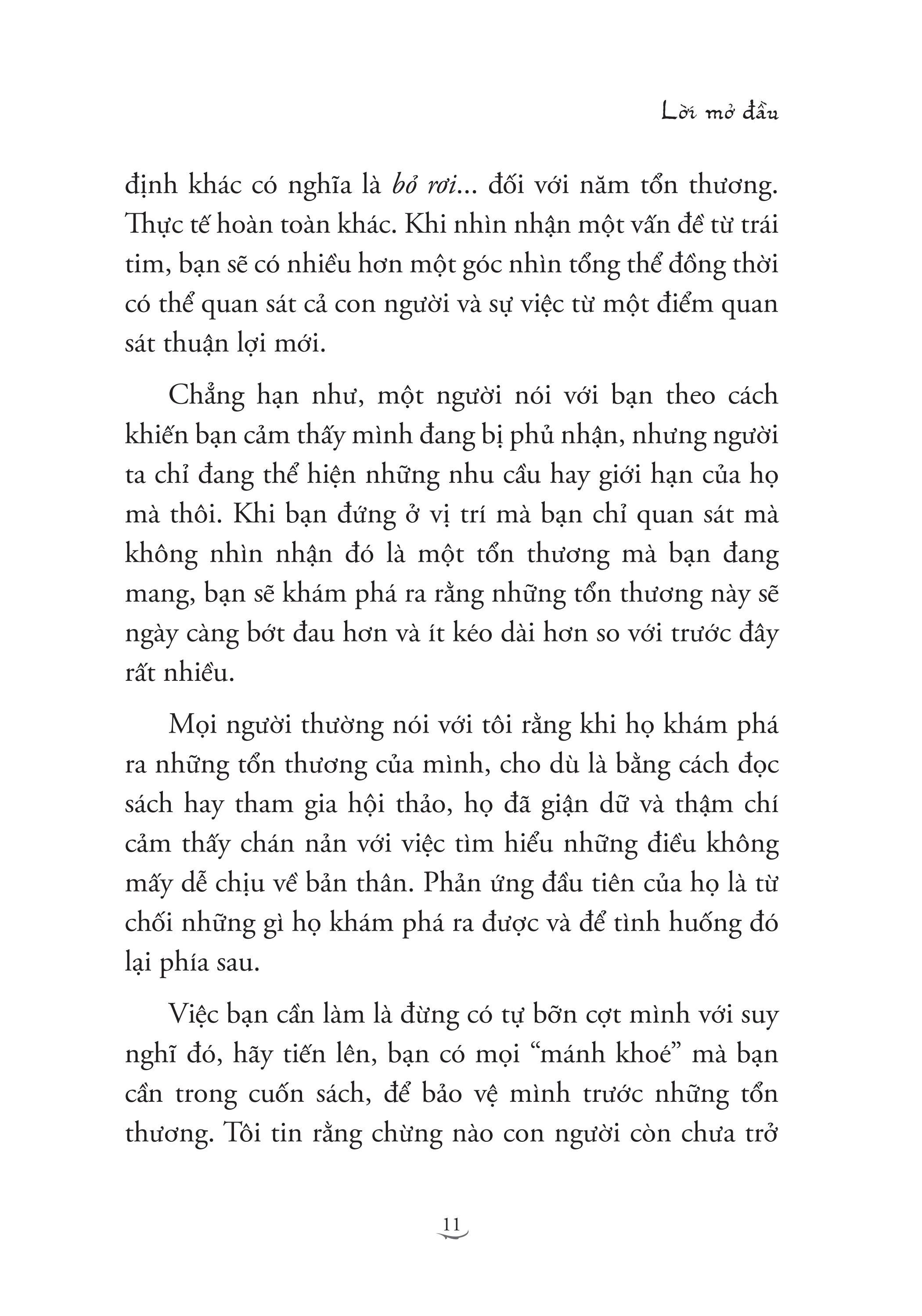 Trong cuốn sách này, bạn sẽ học được cách nhận ra cơ chế của những tổn thương và biết được khi nào thì chúng bị kích hoạt. Để chữa lành được tổn thương thì chúng ta nhất định phải nhận ra vô vàn các trường hợp mà cái tôi (mặt nạ nguỵ trang của chúng ta) dẫn dắt suy nghĩ, lời nói và hành động của chúng ta.