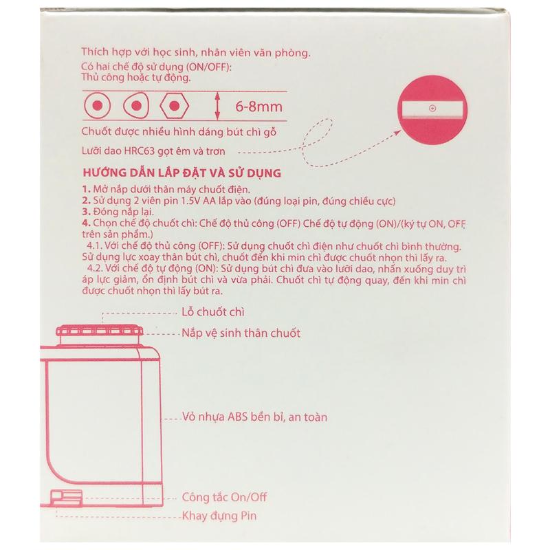 - Chọn chế độ chuốt chì: Chế độ thủ công (OFF) Chế độ tự động (ON)/(ký tự ON, OFF trên sản phẩm) 4.1. Với chế độ thủ công (OFF): Sử dụng chuốt chì điện như chuốt chì bình thường. Sử dụng lực xoay thân bút chì, chuốt đến khi min chì được chuốt nhọn thì lấy ra, 4.2. Với chế độ tự động (ON): Sử dụng bút chì đưa vào lưỡi dao, nhấn xuống duy trì áp lực giảm, ổn định bút chì và vừa phải. Chuốt chì tự động quay, đến khi món chì được chuốt nhọn thì lấy bút ra.