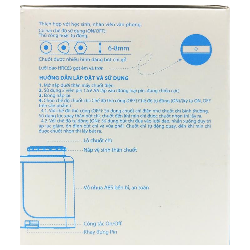 - Chọn chế độ chuốt chì: Chế độ thủ công (OFF) Chế độ tự động (ON)/(ký tự ON, OFF trên sản phẩm) 4.1. Với chế độ thủ công (OFF): Sử dụng chuốt chì điện như chuốt chì bình thường. Sử dụng lực xoay thân bút chì, chuốt đến khi min chì được chuốt nhọn thì lấy ra, 4.2. Với chế độ tự động (ON): Sử dụng bút chì đưa vào lưỡi dao, nhấn xuống duy trì áp lực giảm, ổn định bút chì và vừa phải. Chuốt chì tự động quay, đến khi món chì được chuốt nhọn thì lấy bút ra.