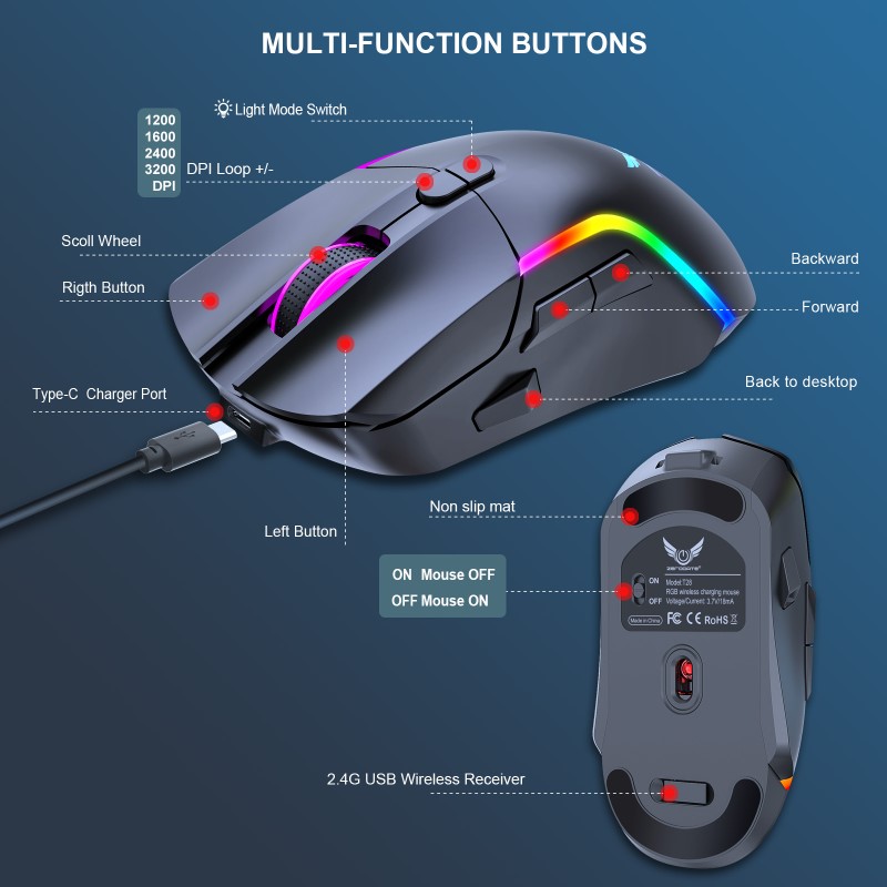 . Chuột Led Không Dây Pin sạc T28 Cổng sạc TypeC chống mỏi cổ tay cho máy tính laptop . Kết Nối : Bluetooth + Đầu thu USB 2.4Ghz nhỏ gọn . Khoảng cách Kết