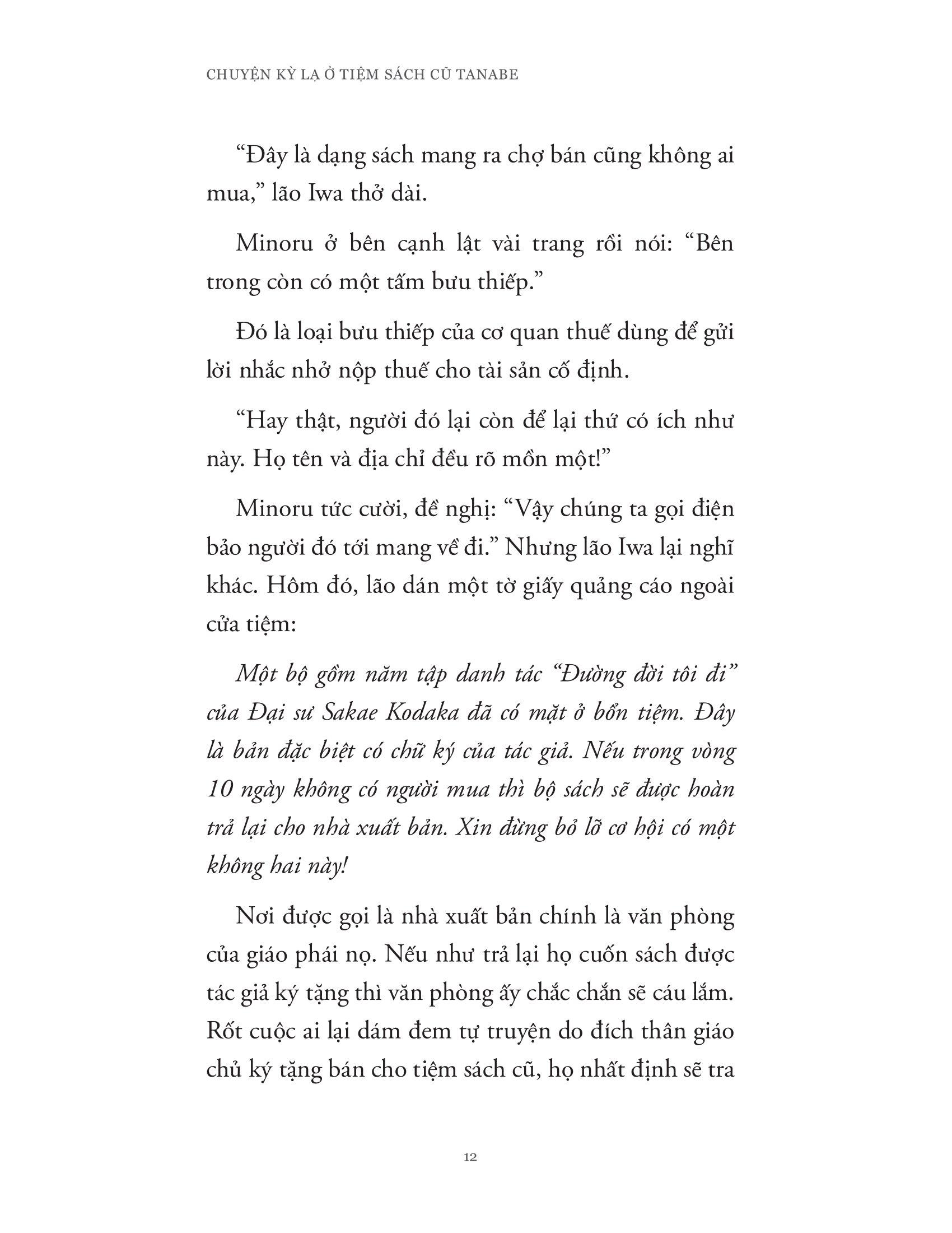 Cuốn sách là một tuyển tập những câu truyện “trinh thám” ngắn liên quan đến hành trình phá án hay đi tìm câu trả lời cho những bí ẩn hay “vụ án” xuất phát hoặc liên quan đến tiệm sách Tanabe nơi lão Iwa làm chủ. Trong suốt những hành trình nhỏ ấy, cả lão Iwa và đứa cháu Minoru của m.ình đã cho độc giả thấy lần lượt từng lớp lang bản chất con người (cả tiêu cực lẫn tích cực) cũng như mối quan hệ và tình cảm gia đình được thể hiện khéo léo qua những tương tác của hai ông cháu.