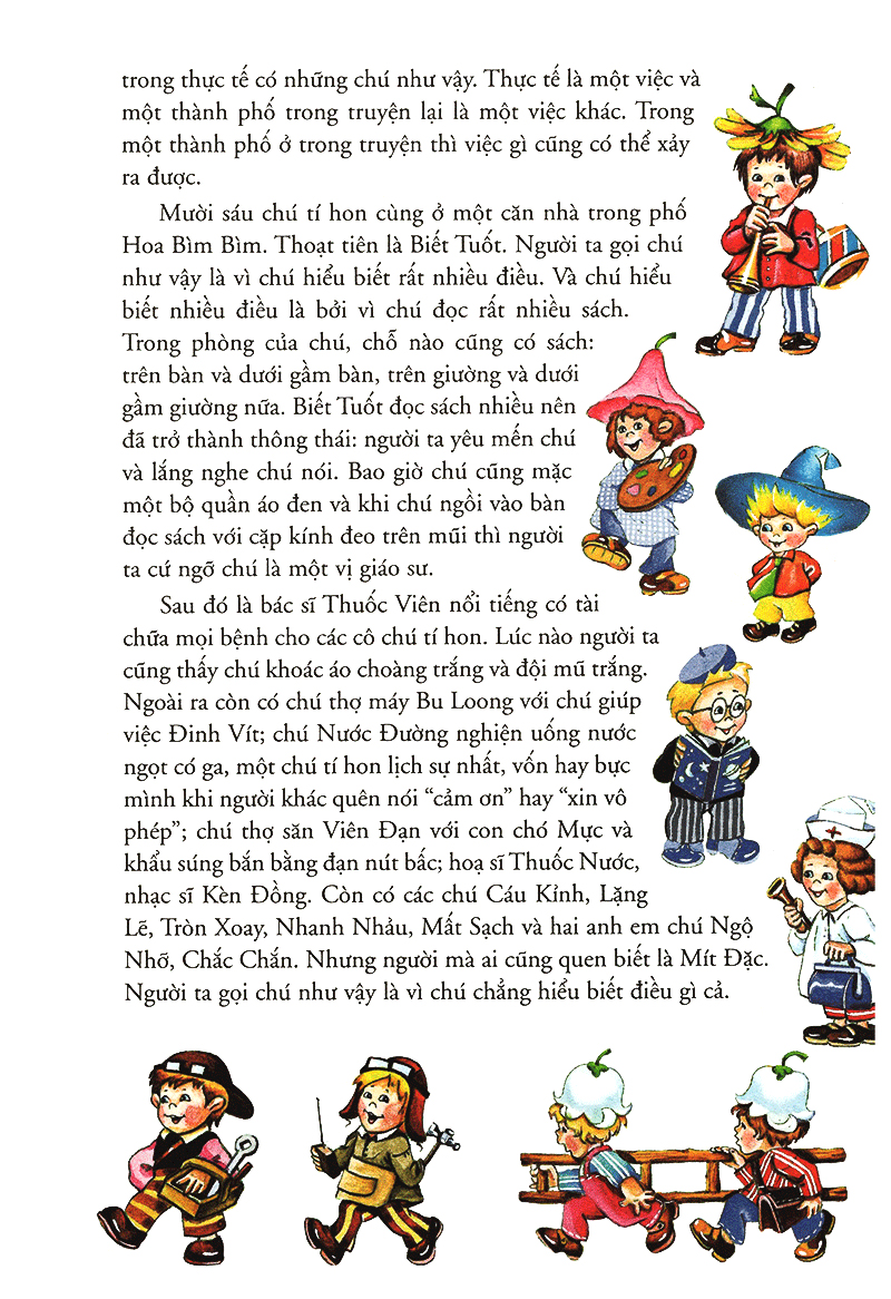 Các bạn đang cầm trên tay cuốn truyện vô cùng hài hước, hấp dẫn và giàu trí tưởng tượng về các chú tí hon ở thành phố Hoa. Đó là Mít Đặc ham hiểu biết, nhưng lại lười suy nghĩ và thiếu kiên trì nên chẳng học được gì. Là Biết Tuốt thông minh, hiểu nhiều biết rộng, chín chắn. Và các chú Tròn Xoay, Ngộ Nhỡ, Mất Sạch, Cáu Kỉnh, nhạc sĩ Kèn Đồng, họa sĩ Thuốc Nước, mỗi người một tính cách, một vẻ đáng yêu riêng.